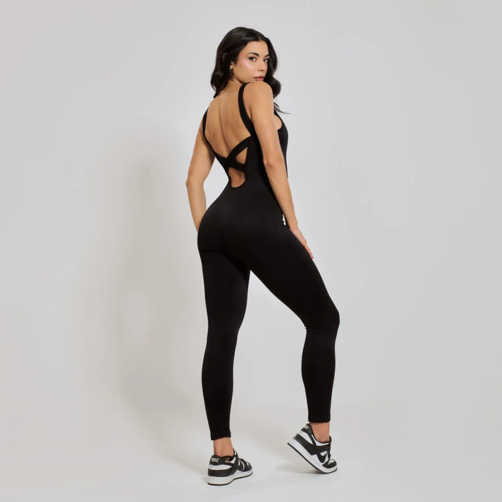 Macacão Fitness sem Costura Costas Cruzadas Preto